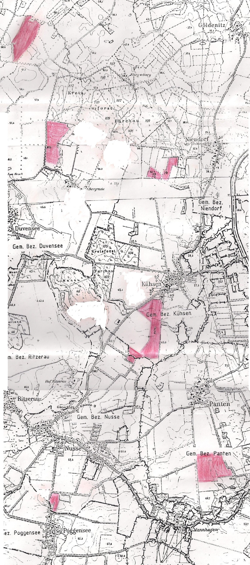 Der Betrieb ist ein reiner Marktfruchtbetrieb, es werden Winterraps, Winterweizen, Wintergerste und Hafer angebaut. In Siek besitze ich keine Flächen mehr, meine Ländereien liegen in und um Kühsen herum in 6 Orten verteilt, nun besitze ich ca. 125 ha Eigenland. Die Flächen sind rot eingezeichnet.