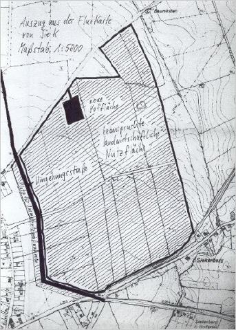 Die Pläne der neuen Gemeindevertretung waren nicht neu, sondern schon ein paar Jahrzehnte alt. Es sollte eine Straße gebaut werden von der Autobahn bis zum Sieker Berg, ein halber Ring im Norden und Osten von Siek in einem Abstand von mehreren hundert Metern zur Wohnbebauung, ohne Rücksicht auf die Landwirtschaft, die Flächen wären krumm und schief zerschnitten worden. Die Pläne kollidierten mit meinen eigenen Plänen, ich wollte meinen Betrieb im Bereich „Ohlenstücken“ arrondieren und schließlich hierhin aussiedeln. Der Plan der Gemeinde hätte meine Flächen so zerschnitten dass eine sinnvolle Milchviehhaltung nicht mehr möglich gewesen wäre. Außerdem wollte ich auch nicht unmittelbar an einer vielbefahrenen Schnellstraße wohnen, der Lärm der von der Hauptstraße zu unserem Wohnhaus drang reichte mir schon. So schrieb ich im November 1994 und November 1995 jeweils einen Brief an den neuen Bürgermeister, um ihn meine Ansichten mitzuteilen. Meine Vorstellungen zeigt das nächste Bild: