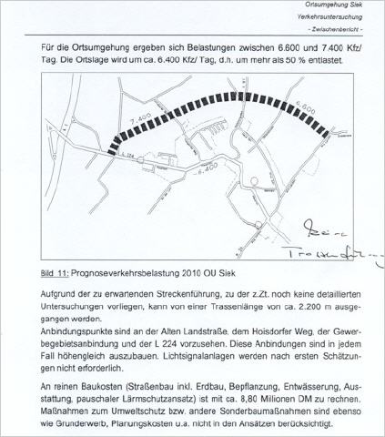Der Ausbau der Autobahn in den 80er Jahren hatte auch nichts gebracht, gerade das Gegenteil war der Fall, die Zahl der Autos pro Fahrspur erhöhte sich trotz zusätzlicher Fahrspur in jeder Richtung. Dadurch wurde die Belastung der Sieker Straßen auch immer größer, der Ruf nach einer Verkehrsentlastung wurde lauter. Durch die Kommunalwahl 1986 kamen die SPD und die WSB (Wählergemeinschaft Sieker Bürger) an die Macht in Siek. Sie setzten auf einen Ausbau der Hauptstraße und lehnten eine Umgehungsstraße von Siek kategorisch ab. Die Hauptstraße ist eine Landesstraße von Schleswig-Holstein, der Ausbau hätte der Gemeinde weniger gekostet als eine neue Straße da das Land den Ausbau bezahlen musste. Die Kommunalwahl 1990 hatten die beiden Parteien auch gewonnen, so dass im Frühjahr 1994 der Ausbau der Hauptstraße beginnen konnte.