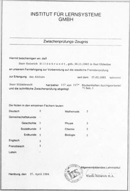 1998 kam die große berufliche Wende. Die Gemeinde Siek wollte das Gewerbegebiet erweitern, und ich sollte eine Fläche dafür abgeben. Das Angebot der Wirtschafts- und Aufbaugesellschaft Stormarn, die meine Fläche erwerben wollte, war sehr großzügig, mein finanzieller Spielraum hätte sich enorm vergrößert. Die Planungen dauern aber viele Monate, und so musste ich mich in Geduld fassen. Aber endlich hatte ich einmal berufliche Perspektiven, weswegen ich das Abitur überhaupt angestrebt hatte, nämlich um beruflich weiter voran zu kommen. Und im Herbst 98 hatte ich es endlich geschafft, die Prüfungen habe ich dieses Mal bestanden. Nun konnte ich endlich zum staatlichen Abitur zugelassen werden. Mein Zwischenprüfungszeugnis sieht diesmal wie folgt aus: