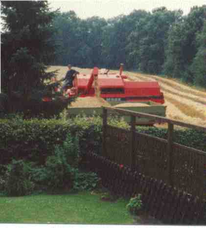 Das Bild zeigt mich auf dem Mähdrescher sitzend während der Gerstenernte 1987.